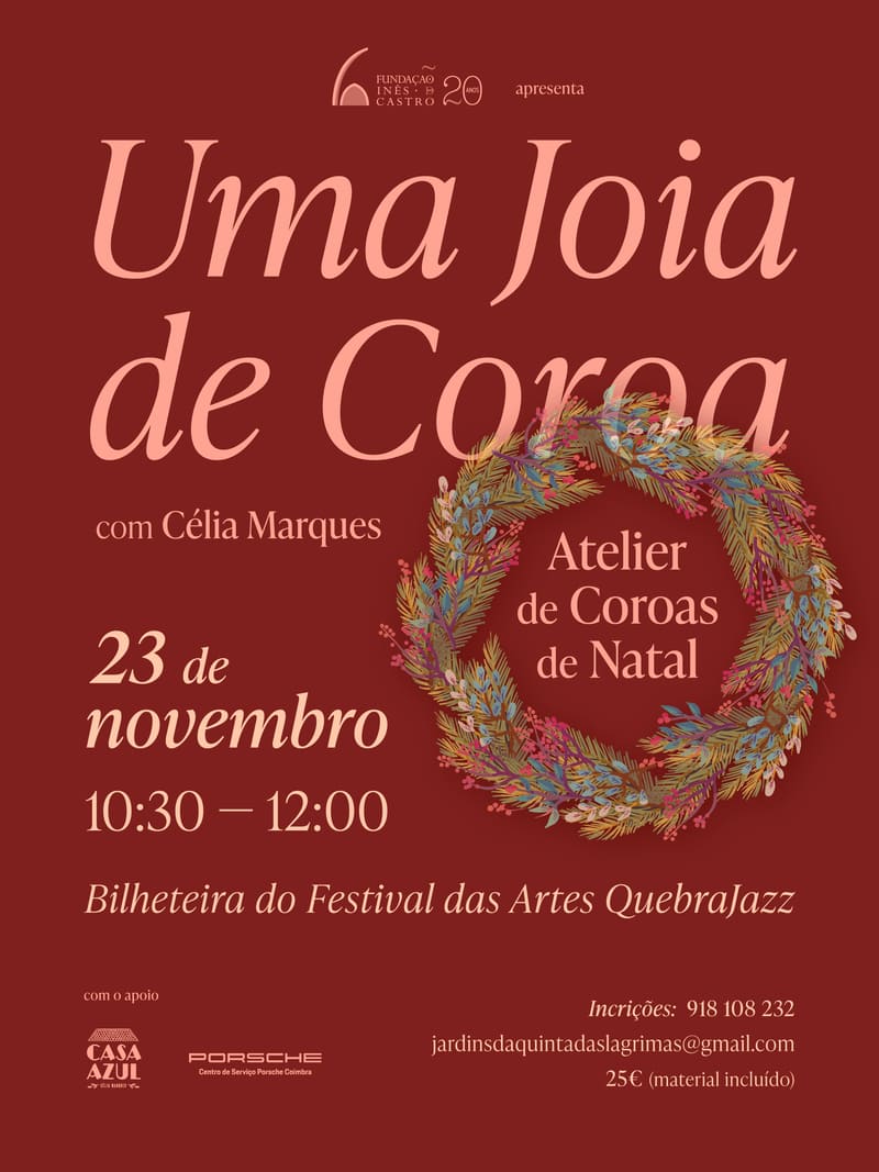 A Fundação Inês de Castro tem muito gosto em divulgar mais uma iniciativa integrada nas Comemorações dos 700 anos de nascimento de Dona Inês de Castro e dos 20 anos da Fundação Inês de Castro, o evento “Uma Joia de Coroa” – Atelier de coroas de Natal, orientado por Célia Marques de Casa Azul, que terá lugar no Domingo, dia 23 de Novembro, das 10h30 às 12h00 nos Jardins da Quinta das Lágrimas, em Coimbra.Inscrições e reservas para: