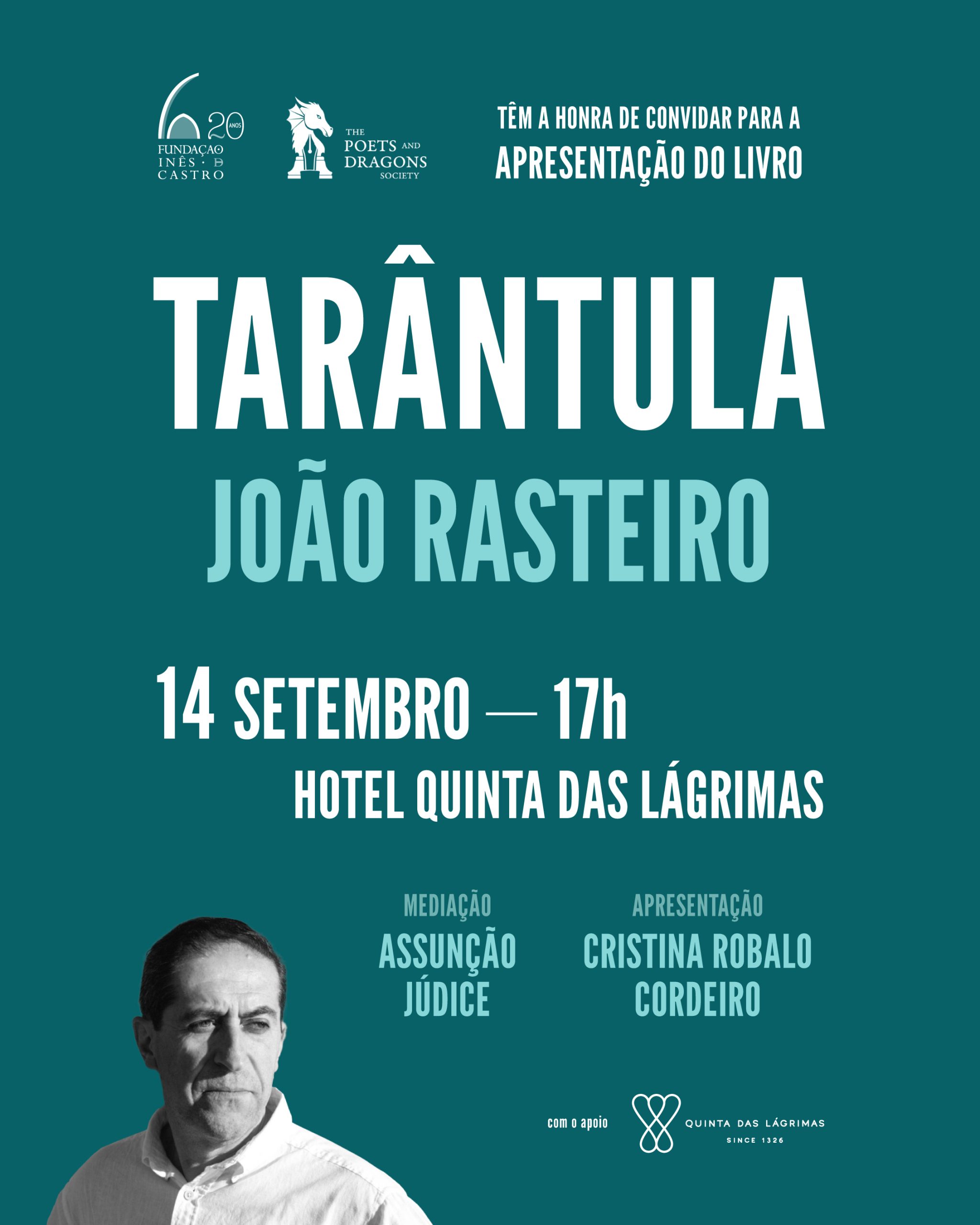 A Fundação Inês de Castro e a editora The Poets and Dragons Society têm a honra de convidar V. Exa. para a apresentação da obra poética Tarântula, de João Rasteiro, no dia 14 de Setembro às 17h00 no Hotel Quinta das Lágrimas em Coimbra.