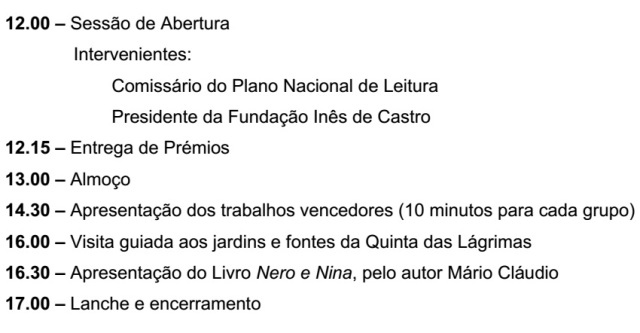 Na próxima 2ª feira, dia 3 de Junho, pelas 12h00, terá lugar a cerimónia de entrega de Prémios aos vencedores da 5ª edição do Concurso Inês de Castro (2012/13), na Quinta das Lágrimas, em Coimbra, com a seguinte agenda: