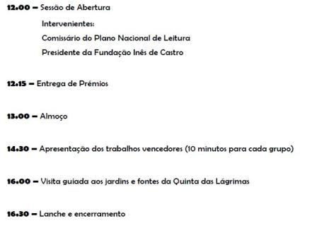 Na próxima 2ª feira, dia 8 de Junho, pelas 12h00, terá lugar a cerimónia de entrega de Prémios aos vencedores da 7ª edição do Concurso Inês de Castro (2014/15), na Quinta das Lágrimas, em Coimbra, com a seguinte agenda: