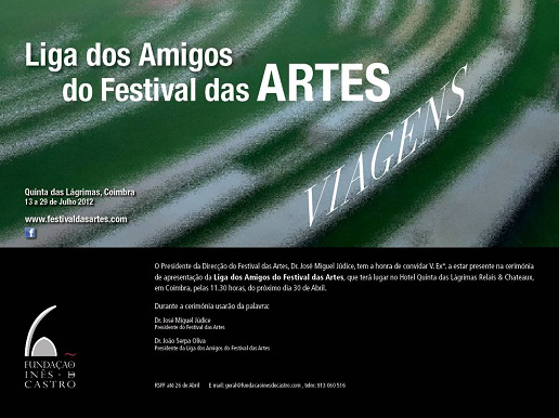 A cerimónia de apresentação da Liga dos Amigos do Festival das Artes terá lugar no próximo dia 30 de Abril, às 11h30, no Hotel Quinta das Lágrimas Relais & Chateaux, em Coimbra.