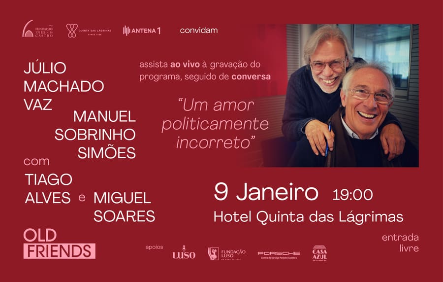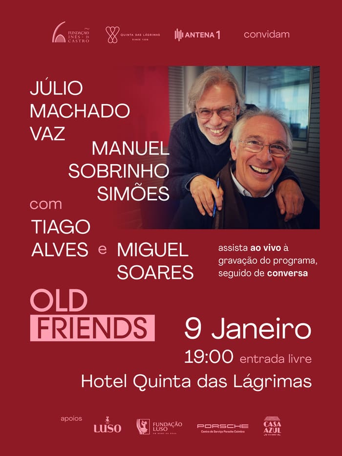 A Fundação Inês de Castro, o Hotel Quinta das Lágrimas e a Antena 1 – RTP convidam para assistir, ao vivo, à gravação do programa “Old Friends” de Júlio Machado Vaz e Manuel Sobrinho Simões com Tiago Alves e Miguel Soares, seguido de conversa.